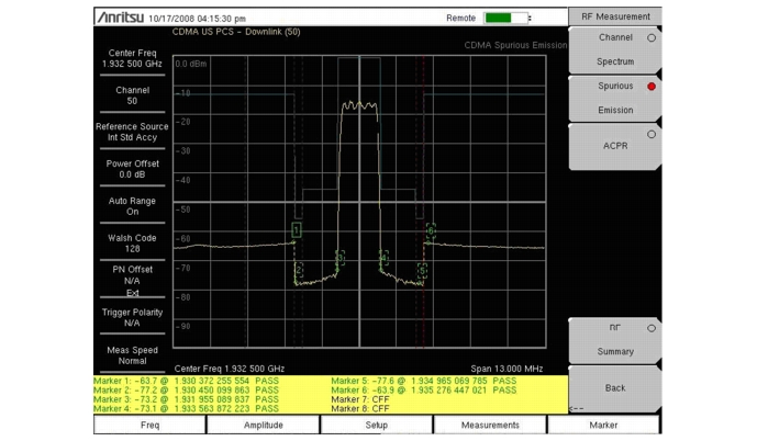 This measurement displays the spectrum of the input signal at specific offsets (based upon the Signal Standard, which is selected from the frequency (