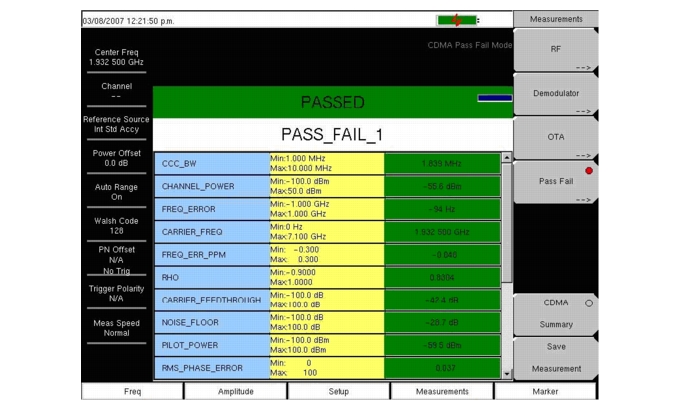 The instrument stores user-defined Pass/Fail criteria for testing base station performance and recalls these models for quick, easy measurements. After selection of a test file, the instrument displays test results in tabular format with clear PASS or FAIL indications that include minimum/maximum threshold.