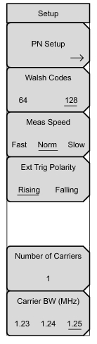 PN Search Type: This submenu key toggles between “Auto” and “Manual” PN search. In the Auto mode, the instrument automatically searches for the strongest PN. When using manual setup, enter the required PN offset to limit the search. Auto search is available only when the trigger selection is GPS or External. If “No Trig” is selected, then pressing this submenu key causes an error message to be displayed, stating “Applicable only when PN Type is GPS or External”.