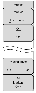 Key Sequence: MarkerPress the Marker main menu key to open the Marker menu. The instrument is equipped with six markers. Any or all markers can be employed simultaneously.