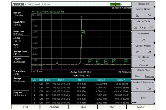 2. Press the Marker Table On Off submenu key so that On is underlined. All markers and delta marker data are displayed in a table under the measurement graph.
