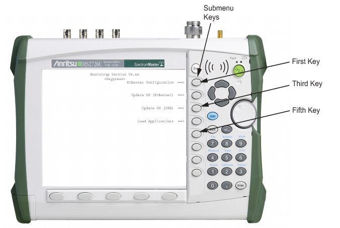 c. Continue holding all 3 submenu keys until the Anritsu logo appears on the measurement display screen, then release them.