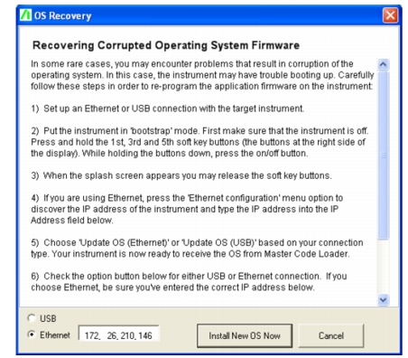 8. Press the Update OS (Ethernet) submenu key (the second submenu key in the bootstrap menu, as shown in Figure: “Spectrum Master Bootstrap Screen”).The Spectrum Master should give you a “Waiting for OS download connection” message.