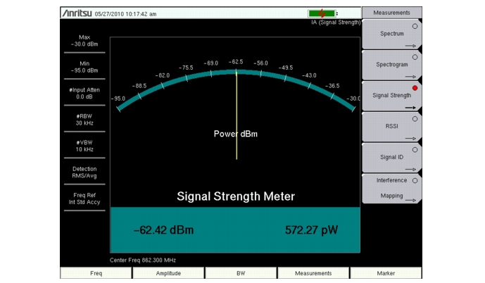The Signal Strength meter is useful for tracking down the source of an interfering signal. This measurement is done at a single frequency in zero span. The power at a frequency (in dBm and watts) is displayed along with an optional audible indicator. Connect a directional antenna and the frequency of the audible indicator increases as the measured signal strength increases. This mode is especially useful when attempting to locate an emitter using a directional antenna.For field strength measurements, antenna factors are included. Antenna factors for all antennas offered by Anritsu are stored in the unit. Custom antenna factors can be created and uploaded into the instrument using Anritsu Master Software Tools software.
