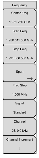 This is a convenient way to narrow the frequency span. The first time the submenu key is pressed, the span value decreases to the nearest even value that starts with 1, 2, or 5. For example if the span is 1.8 MHz, pressing the submenu key for the first time changes the span to 1.0 MHz, the next press takes the value to 500 kHz, then 200 kHz and so on.