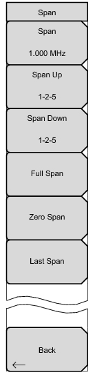 This is a convenient way to quickly arrive at a wider span value. The first time the submenu key is pressed, the span value increases to the nearest even value that starts with 1, 2, or 5. For example if the span is 1.8 MHz, pressing the submenu key for the first time changes the span to 2.0 MHz, the next press takes the value to 5.0 MHz and so on.