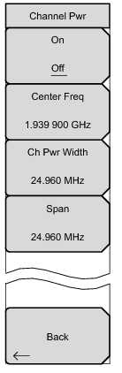 Begins or ends the channel power measurement. When the measurement is on, Ch Pwr will appear below the display. The detection method will automatically be changed to RMS Average when the measurement is started. The detection method can be modified by pressing the