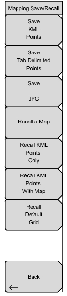 Opens the Recall menu for selecting a .kml file. If you already have a geo referenced map or a default grid map, press this key to recall previously stored KML points. This is useful if you made measurements earlier without the appropriate maps and would like to now view a map file with the saved point locations and directions displayed on top of the map.