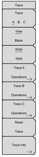 To access the functions under the Trace menu, press the Shift key, then the Trace (5) key. The instrument is capable of displaying up to three traces, one with live data, and the other two either with stored data or trace math data.