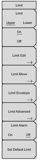 Two types of limit lines can be specified, lower limit lines and upper limit lines. Limit lines can be used for visual reference only, or for pass/fail criteria using the limit alarm (Figure: “IA Limit Menu”). Limit alarm failures are reported whenever a signal is above the upper limit line or below the lower limit line. By using save-on-event, a signal that causes a limit alarm can be automatically saved. See the User Guide for details.Each limit line can consist of a single segment, or as many as 40 segments across the entire frequency span of the instrument. These limit segments are retained regardless of the current frequency span of the instrument, which allows the configuring of specific limit envelopes at various frequencies of interest without having to re-configure them each time the frequency is changed.