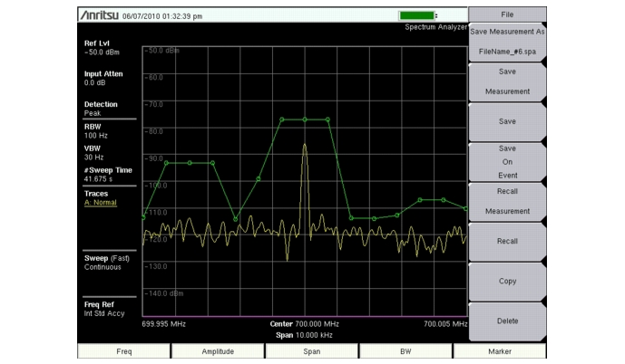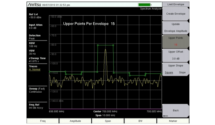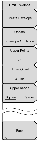 This submenu key is used to define how far away from the measured signal the upper or lower envelope will be placed. The limits are ±100 dB. For an upper envelope, usually the value will be positive in order to place the envelope above the signal. For a lower envelope, the value will usually be negative in order to place the envelope below the signal.