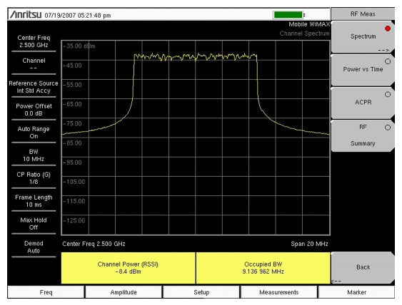 2. Press the Spectrum submenu key again to open the Spectrum menu and change the Span, if desired. Span choices are: 5 MHz, 10 MHz, 20 MHz, and 30 MHz. The sample image in Figure: “Mobile WiMAX Spectrum Measurement” may differ from any image on your instrument.