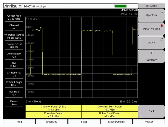 Power versus TimeThe Power versus Time view shows the time domain view of a Mobile WiMAX signal over approximately one frame. The screen also displays Channel Power (RSSI), Downlink Burst Power, Uplink Burst Power, and Preamble Power. The sample image in Figure: “Mobile WiMAX Power versus Time Measurement” may differ from any image on your instrument.