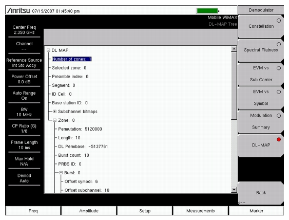 2. Use the Up/Down and Left/Right arrow keys to close or to open subordinate lists within the map. The sample image in Figure: “Mobile WiMAX Demodulator DL‑MAP Measurement” may differ from any image on your instrument.