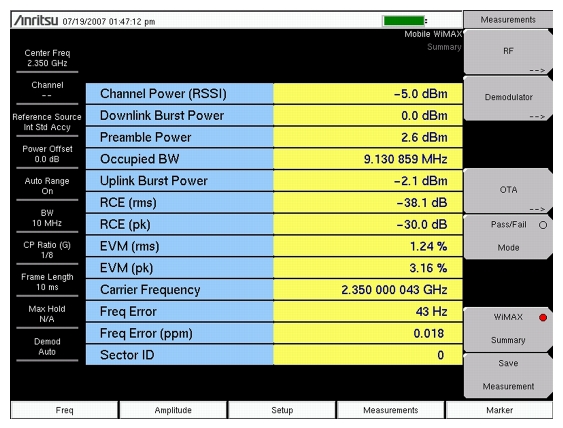 WiMAX SummaryThe WiMAX Summary is a summary of critical Mobile WiMAX measurements from the RF and Demodulator measurements: Channel Power (RSSI) in dBm, Downlink Burst Power in dBm, Preamble Power in dBm, Occupied BW in Hz, Uplink Burst Power in dBm, RCE (rms) in dB, RCE (pk) in dB, EVM (rms) in %, EVM (pk) in %, Carrier Frequency in Hz, Freq Error in Hz, CINR, Base Station ID, and Sector ID.