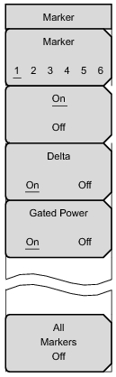 This feature is available only when the Power vs Time measurement is activated from the RF Meas menu (Measurements > RF > Power vs. Time).These instruments have 6 regular line markers and 6 delta markers. Marker information includes time and power level in dBm. Delta marker information includes delta time and delta power.Key Sequence: Marker