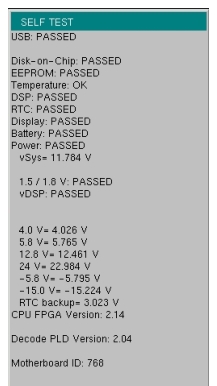 Figure: Self Test Results Window, which summarizes the status of several key functions in the instrument that are common to all applications (note that your instrument display may differ from this image). If any subtest shows FAILED, then check that the battery level is adequate for operation, or check that the temperature is within acceptable limits. Reset to factory defaults with either
