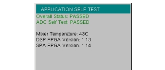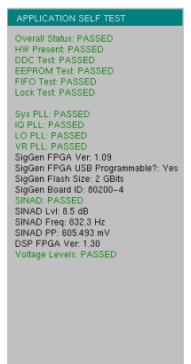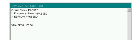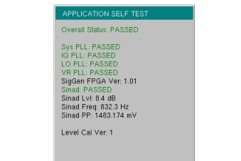 To run the application self test, press Shift and System (8) and then Application Self Test from within the desired mode. When you are in Vector Network Analyzer mode, you will see the results window that is shown in Figure: Application Self Test (note that your instrument display may differ from this image). It summarizes the status of several key functions that are specific to this application.