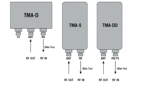 • TMA-S: A receive-only tower mounted amplifier is installed between the receiving antenna and the radio to boost weak signals. This configuration is common on systems that implement separate antennas for transmitting and receiving.