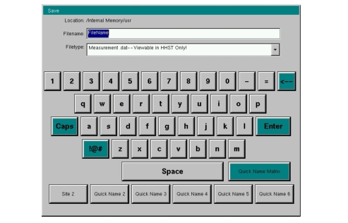 When entering text, as when saving a measurement, the touch screen keyboard is displayed (Figure: Touch Screen Keyboard). Characters are entered directly with the touch screen keyboard. The keypad can be used for numeric entry. The left and right arrow keys scroll the cursor through the filename. Refer to Save Menu for additional information.