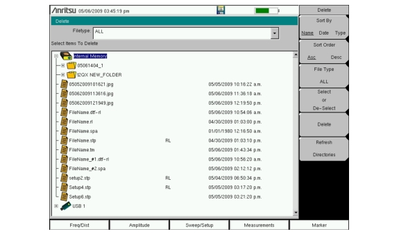 Press the Delete submenu key to open the Delete dialog box (Figure: Delete Dialog Box). The menus allow sorting by file type, name, and saved date. Refer to the Delete Menu for additional information.