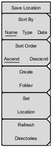 ![]() | Sort By Name Date type Press this submenu key to sort the folders by Name, Type, or Date. Sort Order Asc Desc Press this submenu key to display the folder names in ascending or descending order. Create Folder Press this submenu key to create a new folder in the highlighted location or folder. Name the new folder in the create directory dialog box. Set Location Press this submenu key to set the current location for saving files and then return to the Save Menu. Refresh Directories Press this submenu key to update the display. |