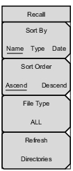 ![]() | Use these menu keys to change the way files are listed in the Recall dialog box. Navigate to the desired file, then press Enter to recall. When recalling a saved setup, all current instrument settings are replaced by the stored setup information. When recalling a saved measurement and multiple traces are displayed, parameter settings shown on the instrument screen may reflect those of the recalled trace or the active trace, depending on the measurement mode or other factors. Sort By Name Date Type Press this submenu key to sort files and folders by the file name, by the type of file, or by the date that the file or folder was saved. Sort Order Asc Desc Displays the folder or file in ascending or descending order based on the selection in the Sort By key. File Type Press this submenu key to select the type of file to be viewed. The file type can be changed with the Up/Down arrow keys, the rotary knob, or the touch screen. Press Enter to make the selection. Refer to File Types for file type descriptions. Refresh Directories Press this key to update the display. |