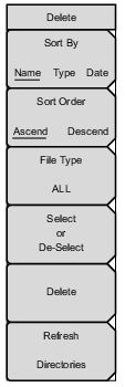 ![]() | Sort By Name Date Type Press this submenu key to sort files and folders by name, by the type of file, or by the date that the file or folder was saved. Sort Order Asc Desc Press this submenu key to display the folders or files in ascending or descending order based on the selection in the Sort By key. File Type Press this submenu key to select the type of file to be deleted. The file type can be changed with the Up/Down arrow keys, the rotary knob, or the touch screen. Press Enter to make the selection. Refer to File Types for file type descriptions. Select or De‑Select Press this submenu key to select or deselect the files or folders to be deleted. When selected, a file or folder is outlined in blue. Delete Press this submenu key to open the Delete dialog box. Press Enter to delete the selected item, or press Esc to Cancel. Refresh Directories Press this submenu key to update the display. |