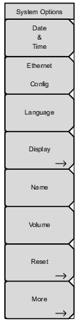 ![]() | Date & Time Press this submenu key to display a dialog box for setting the current date and time. Use the submenu keys or the Left/Right arrow keys to select the field to be modified. Use the keypad, the Up/Down arrow keys, or the rotary knob to select the date and time. Press Enter to accept the changes, or press the Esc key to return to normal operation without making changes. Ethernet Config (Optional) Press this key to display the Ethernet submenu and to open the Ethernet Editor dialog box, where you can set the instrument IP address. For details, refer to Ethernet Connectivity. Language Press this submenu key to open a list box and select a built‑in language for the instrument display. Press Enter to apply the change, or press Esc to cancel. The languages that are currently available are: English, French, German, Spanish, Japanese, Chinese, Korean, Italian, Russian, and Portuguese. You can edit non-English language captions using Master Software Tools (MST). If a mode does not have language translations available, then English is the default language. Caution: A firmware update or any instrument reset will overwrite modifications you may have made in any of the language files. Display The Display submenu key opens the Display Settings Menu, allowing brightness control and the selection of different display attributes. Name Press this submenu key to open the Unit Name dialog, where you can enter a name for the instrument, using the touch screen keyboard. Press Enter to save the name. The assigned instrument name appears in measurement files, setup files, limit line files, and MST reports. It is displayed on the browser page banner when the instrument is connected to a remote PC or mobile device. Volume Press this submenu key to view or adjust the speaker volume. The current volume setting is displayed in the Volume input box. Use the numeric keypad, the Up/Down arrow keys, or the rotary knob to change the value, and press Enter to apply the change. Reset Press this submenu key to open the Reset Menu. More Press this submenu key to open the System Options 2/2 Menu. |