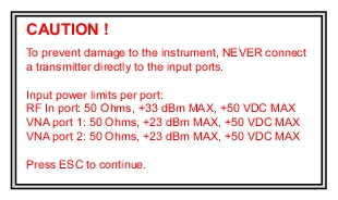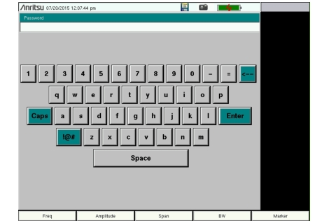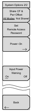 ![]() | Share CF & Pwr Offset All Modes Not Shared Press this submenu key to toggle the setting between All Modes and Not Shared. Select All Modes to have the current center frequency setting and power offset setting carried over when changing measurement modes. This function is not applicable to measurements that do not have a center frequency or power offset setting or to measurements in which the current center frequency or power offset setting is outside the range of the new measurement. Set Remote Access Password Press this submenu key to open the Password entry dialog (see Figure: Remote Access Password Dialog). Use the touch screen keyboard to enter the new password. Passwords may contain digits, uppercase and lowercase letters, and the symbols - _ + . (hyphen, underscore, plus, period). Press Enter to save or Esc to cancel. Setting the remote password and rebooting the instrument will lock it from Telnet and FTP connections. This means that connecting to the instrument via Master Software Tools (v2.21.1 or later), Wireless Remote Tools (WRT), or the Web Remote Control browser interface will require the set password. To unlock the instrument, remove the password by setting it to blank. The password is also removed following a Master Reset, Factory Defaults reset, or a firmware update. Power–On Press this submenu key to open the Power–On Menu. Input Power Warning On Off Press this submenu key to toggle a brief display of the input power caution message at startup (see Figure: Input Power Caution Text Box). Back Press this submenu key to return to the System Options Menu. |
