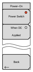 ![]() | Power Switch Press this submenu key to set the LMR Master for normal use of the On/Off button on the instrument front panel. When DC Applied Press this submenu key to set the LMR Master to automatically restart when DC power is applied to the External Power connector (see Figure: Test Panel Connectors). Refer to External Power On. In this mode, the Power button does not turn off the instrument, merely recycles it. Back Press this submenu key to return to the System Options 2/2 Menu. |
