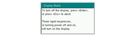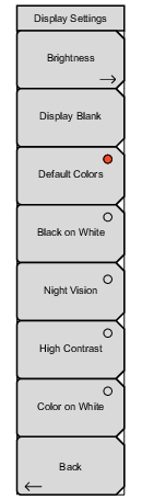 ![]() | Brightness: Opens the Brightness Settings Menu. Display Blank Opens the message box illustrated in Figure: Display Blank Message Box. Press Enter to turn off the display, or press Esc to abort. To turn the display back on, press any key (except the Power button) three times in rapid succession. A power cycle also turns the display back on. Default Colors Sets the display colors to the factory defaults. Used for normal viewing. Black on White Sets the display colors to black on a white background for printing and viewing in broad daylight conditions. See Figure: LMR Master Display Settings for illustrations of the display color schemes selectable in this submenu. Night Vision Sets the display to a red-tinted color on a black background. The front panel keypad is backlighted in red. This setting is optimized for nighttime viewing. High Contrast: Increases the black-and-white contrast of the default display. This setting is used in challenging viewing conditions. Color on White Sets the display background to white, the grid to gray, and leaves sweep data in color. This setting is used for printing and viewing in broad daylight conditions. Back Press this submenu key to return to the System Options Menu. |