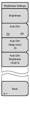 ![]() | The brightness of the display can be adjusted to optimize viewing under a wide variety of lighting conditions. Brightness: Press this key to open the Brightness Editor window, where you can adjust the display brightness level from 0 to 100, with 100 being the brightest. See Figure: Brightness Editor Input Box. Use the rotary knob to adjust the value in increments of 5, or press the Up/Down arrow keys to change the value in increments of 25. Press the Left or the Right arrow key to jump to 0 or 100, respectively. Press Enter to accept the change; press Esc to retain the previous setting. All display elements on the instrument screen are affected by the Brightness setting. Auto Dim On/Off Press this key to toggle the display auto-dimming feature on and off. Enabling auto-dim can extend battery life. Auto Dim Delay Press this key to adjust the amount of idle time, from 1 to 15 minutes, before the instrument display goes dim. Use the arrow keys or the rotary knob to adjust the value in increments of 1 minute. You can also use the numeric keypad, then press Enter. Out-of-range values are ignored and decimal entries are rounded down to next lower minute. Auto Dim Brightness Press this key to select the brightness percentage level of the display when it is dimmed. Use the arrow keys or the rotary knob to adjust the value in increments of 5%, from 0% to 25%. You can also use the numeric keypad, then press % or the Enter key. Out-of-range values are ignored. Back Press this key to return to the Display Settings Menu. |