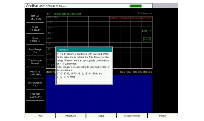 Attempting to make a PIM measurement when the intermod product is out of the filter range of the instrument causes display of the error message shown in Figure: Attention Message for IM Range Error.Notice the instrument settings summary on the left side of the sweep window. The IMD 5(–) is at 1,810 MHz and is outside of the listed filter ranges.Either change the frequency values for F1 and F2, or change the IMD order (3rd, 5th, or 7th) under the Frequency main menu so that the IM product of F1 and F2 is in the frequency filter bands of the instrument.Press Esc to clear the message.