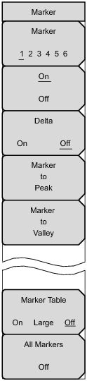 Key Sequence: MarkerPress the Marker main menu key to open the Marker menu. The instrument is equipped with six markers. Any or all markers can be employed simultaneously.
