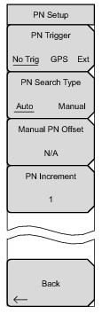 PN Search Type: This submenu key toggles between “Auto” and “Manual” PN search. In the Auto mode, the instrument automatically searches for the strongest PN. When using manual setup, enter the required PN offset to limit the search. Auto search is available only when the trigger selection is GPS or External. If “No Trig” is selected, then pressing this submenu key causes an error message to be displayed, stating “Applicable only when PN Type is GPS or External”.