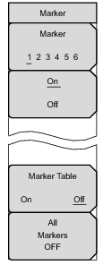 Key Sequence: MarkerPress the Marker main menu key to open the Marker menu. The instrument is equipped with six markers. Any or all markers can be employed simultaneously.