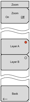 On OffPress this submenu key to toggle between displaying all graphs or displaying an enlarged graph of the selected Layer.Layer APress this submenu key to select the Layer A graph. The graph outline and center axes are changed to be displayed in green rather than white. When Zoom is On, the selected graph is enlarged.Layer BPress this submenu key to select the Layer B graph. When selected, the submenu key circle is displayed in red.Press this submenu key to return to the Constellation Meas Setup (2/2) menu.While either the Meas Setup (2/2) menu or the Zoom menu is displayed, the Zoom On/Off feature can be toggled On and Off by pressing the Enter key. The graph that is enlarged when Zoom is On is the graph that is selected in the Zoom menu.The Zoom feature is used to enlarge one graph. The Layer submenu keys are used to select the layer that will be enlarged by using Zoom. The active Layer submenu key displays a red circle, and its graph outline and center axes are changed to be displayed in green rather than white.