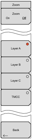 On OffPress this submenu key to toggle between displaying all graphs or displaying an enlarged graph of the selected Layer.Layer APress this submenu key to select the Layer A graph. The graph outline and center axes are changed to be displayed in green rather than white. When Zoom is On, the selected graph is enlarged.Layer BPress this submenu key to select the Layer B graph. When selected, the submenu key circle is displayed in red.Layer CPress this submenu key to select the Layer C graph. When selected, the submenu key circle is displayed in red.Press this submenu key to select the TMCC graph. When selected, the submenu key circle is displayed in red.Press this submenu key to return to the Constellation Meas Setup (2/2) menu.While either the Meas Setup (2/2) menu or the Zoom menu is displayed, the Zoom On/Off feature can be toggled On and Off by pressing the Enter key. The graph that is enlarged when Zoom is On is the graph that is selected in the Zoom menu.