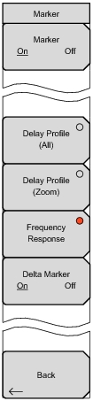 Press this submenu key to toggle the marker On and Off. When On, the marker feature is displayed in the selected graph (submenu key with red circle). Also when On, the Delay Profile (All), Delay Profile (Zoom), and Frequency Response submenu keys are displayed.