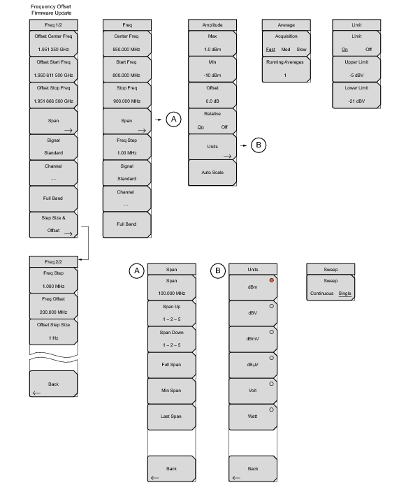 Figure 2‑3 shows the map of the Power Meter menus. The following sections describe main menus and associated submenus. The submenus are listed in the order they appear on the display from top to bottom under each main menu.