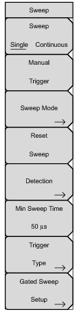 This submenu key toggles between continuous sweep and single sweep. In single sweep mode, the results of a sweep are displayed on the screen while the instrument awaits a trigger event to start a new sweep.