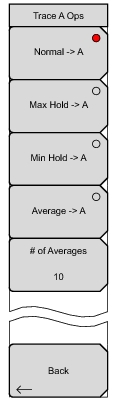 Trace A Ops Menu Key Sequence: Shift > Trace (5) key > Trace A Operations IA Trace A Ops Menu Normal -> A Displays data for the current trace sweep. Max Hold -> A Shows the cumulative maximum value of each display point over many trace sweeps. Min Hold -> A Shows the cumulative minimum value of each display point over many trace sweeps. Average -> A Shows an exponential average of a number of traces, determined by the # of Averages key. # of Averages Sets the number of traces for use in calculating the average display value. Then number used for averaging ranges from 1 to 65535. Back Returns to the “Trace Menu” on page 4‑56.