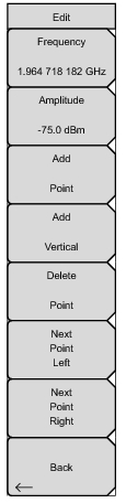 Press this submenu key to add a limit line inflection point. The precise behavior of this submenu key depends upon which inflection point is active at the time that the key is pressed. If the active limit point is somewhere in the middle of a multi-segment limit line, then a new limit point is added that is halfway between the currently active point and the point immediately to its right. The amplitude of the inflection point will be such that it falls on the limit line. For example, if a limit point exists at 2.0 GHz with an amplitude of –30 dBm, and if the next point is 3.0 GHz with an amplitude of –50 dBm, then the added point will be at 2.5 GHz with an amplitude of –40 dBm. The frequency and amplitude values of the new point can be adjusted as needed with the Frequency and Amplitude submenu keys.