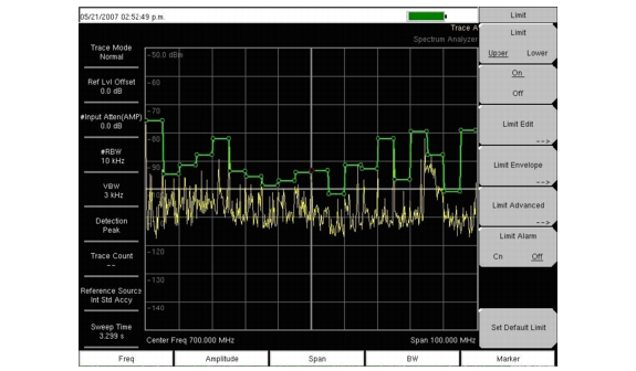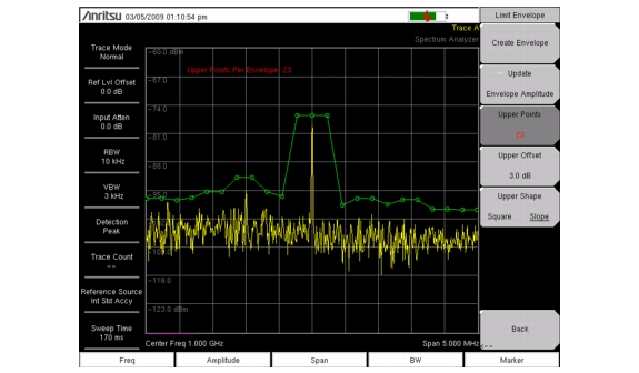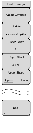 This submenu key is used to define how far away from the measured signal the upper or lower envelope will be placed. The limits are ±100 dB. For an upper envelope, usually the value will be positive in order to place the envelope above the signal. For a lower envelope, the value will usually be negative in order to place the envelope below the signal.