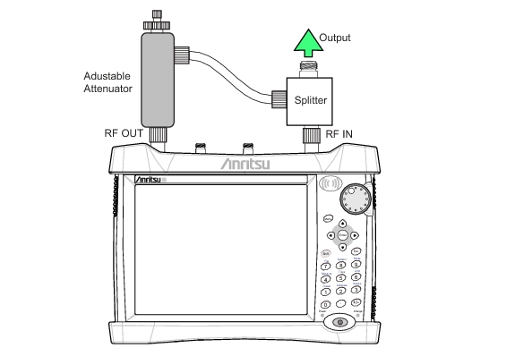 Connect the attenuator to the RF Out port and the splitter to the RF In port as show in Figure: CW Signal Generator Configuration.