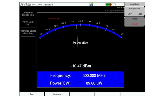 Press the Amplitude key and set the power level to High or Low. The typical nominal output power in the high setting is about 0 dBm. The typical nominal output power in the low setting is about –30 dBm.