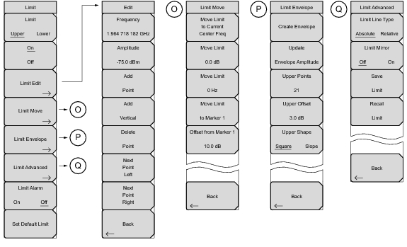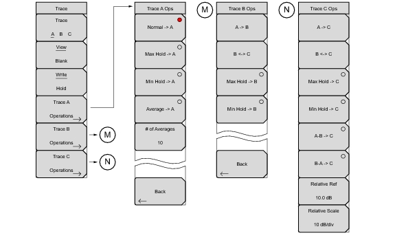 Figure 7‑10 though Figure 7‑15 show the map of the Spectrum Analyzer menus. Refer to Spectrum Analyzer for the details of the menus and associated submenus.Coverage Mapping Menu describes the details of Coverage Mapping (Option 431) menus and associated submenus.