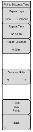 Toggles between using a Time or Distance interval for capturing data.Sets the time interval when the Time is selected in the Repeat Type button.Sets the distance interval when the Distance is selected in the Repeat Type button.Refer to Spectrum Analyzer for additional spectrum analyzer menus.