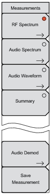 Press to view a summary of the RF Spectrum, Audio Spectrum, and Audio Waveform measurements. The circle on the submenu key face is red when the measurement is active. The results are displayed in table format.